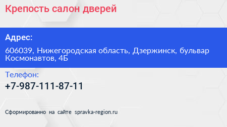 Крепость, салон дверей по адресу 606039, Нижегородская область, Дзержинск, бульвар Космонавтов, 4Б в дальнейшем Организация, размещена в следующих категориях: