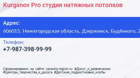 Kurganov.Pro, студия натяжных потолков по адресу 606015, Нижегородская область, Дзержинск, Будённого, 2 в дальнейшем Организация, размещена в следующих категориях: