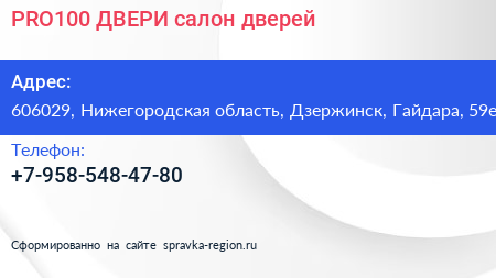 PRO100 ДВЕРИ, салон дверей по адресу 606029, Нижегородская область, Дзержинск, Гайдара, 59е в дальнейшем Организация, размещена в следующих категориях: