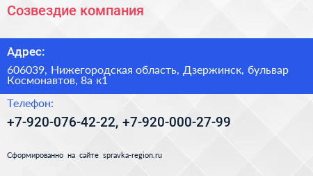 Созвездие, компания по адресу 606039, Нижегородская область, Дзержинск, бульвар Космонавтов, 8а к1 в дальнейшем Организация, размещена в следующих категориях: