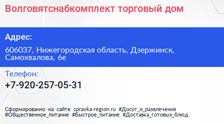 Волговятснабкомплект, торговый дом по адресу 606037, Нижегородская область, Дзержинск, Самохвалова, 6е в дальнейшем Организация, размещена в следующих категориях:
