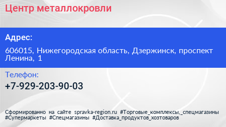 Центр металлокровли по адресу 606015, Нижегородская область, Дзержинск, проспект Ленина, 1 в дальнейшем Организация, размещена в следующих категориях: