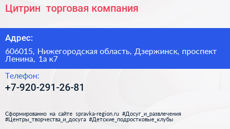 Цитрин+, торговая компания по адресу 606015, Нижегородская область, Дзержинск, проспект Ленина, 1а к7 в дальнейшем Организация, размещена в следующих категориях: