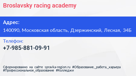 Broslavsky racing academy по адресу 140090, Московская область, Дзержинский, Лесная, 34Б в дальнейшем Организация, размещена в следующих категориях: