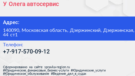 У Олега, автосервис по адресу 140090, Московская область, Дзержинский, Дзержинская, 44 ст1 в дальнейшем Организация, размещена в следующих категориях: