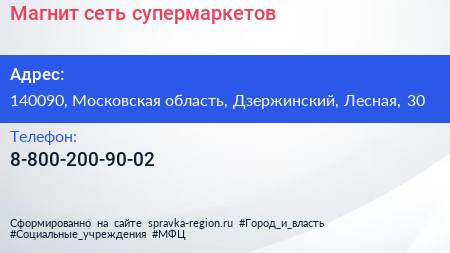 Магнит, сеть супермаркетов по адресу 140090, Московская область, Дзержинский, Лесная, 30 в дальнейшем Организация, размещена в следующих категориях: