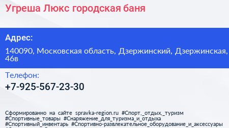 Угреша Люкс, городская баня по адресу 140090, Московская область, Дзержинский, Дзержинская, 46в в дальнейшем Организация, размещена в следующих категориях: