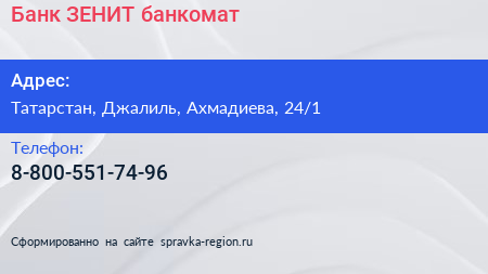 Банк ЗЕНИТ, банкомат по адресу Татарстан, Джалиль, Ахмадиева, 24/1 в дальнейшем Организация, размещена в следующих категориях: