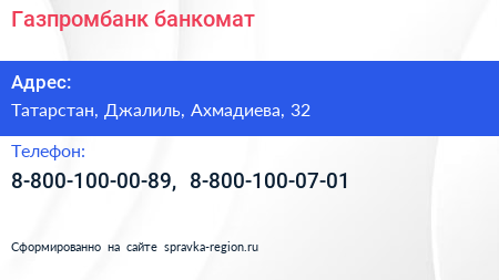Газпромбанк, банкомат по адресу Татарстан, Джалиль, Ахмадиева, 32 в дальнейшем Организация, размещена в следующих категориях: