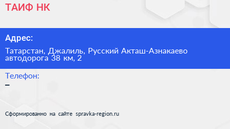 ТАИФ-НК по адресу Татарстан, Джалиль, Русский Акташ-Азнакаево автодорога 38 км, 2 в дальнейшем Организация, размещена в следующих категориях: