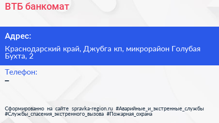 ВТБ, банкомат по адресу Краснодарский край, Джубга кп, микрорайон Голубая Бухта, 2 в дальнейшем Организация, размещена в следующих категориях:
