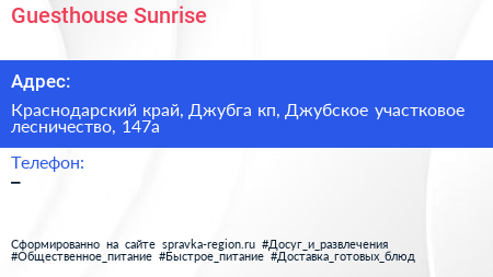 Guesthouse Sunrise по адресу Краснодарский край, Джубга кп, Джубское участковое лесничество, 147а в дальнейшем Организация, размещена в следующих категориях: