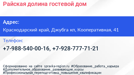 Райская долина, гостевой дом по адресу Краснодарский край, Джубга кп, Кооперативная, 41 в дальнейшем Организация, размещена в следующих категориях: