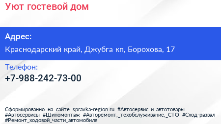 Для связи с организацией воспользуйтесь номером телефона: +7-988-242-73-00. Ежедневно с 00:00 до 24:00. нерабочие месяцы: , вы можете обратиться в эту организацию.