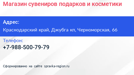 Магазин сувениров, подарков и косметики по адресу Краснодарский край, Джубга кп, Черноморская, 66 в дальнейшем Организация, размещена в следующих категориях: