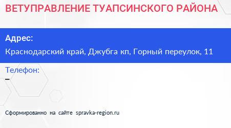ВЕТУПРАВЛЕНИЕ ТУАПСИНСКОГО РАЙОНА по адресу Краснодарский край, Джубга кп, Горный переулок, 11 в дальнейшем Организация, размещена в следующих категориях: