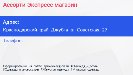 Ассорти-Экспресс, магазин по адресу Краснодарский край, Джубга кп, Советская, 27 в дальнейшем Организация, размещена в следующих категориях: