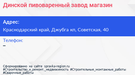 Динской пивоваренный завод, магазин по адресу Краснодарский край, Джубга кп, Советская, 40 в дальнейшем Организация, размещена в следующих категориях: