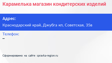Карамелька, магазин кондитерских изделий по адресу Краснодарский край, Джубга кп, Советская, 35в в дальнейшем Организация, размещена в следующих категориях: