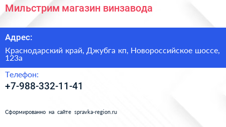 Мильстрим, магазин винзавода по адресу Краснодарский край, Джубга кп, Новороссийское шоссе, 123а в дальнейшем Организация, размещена в следующих категориях: