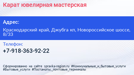 Карат, ювелирная мастерская по адресу Краснодарский край, Джубга кп, Новороссийское шоссе, 8/33 в дальнейшем Организация, размещена в следующих категориях: