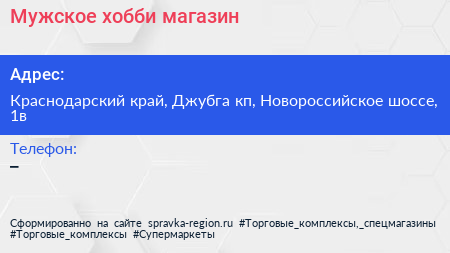 Мужское хобби, магазин по адресу Краснодарский край, Джубга кп, Новороссийское шоссе, 1в в дальнейшем Организация, размещена в следующих категориях: