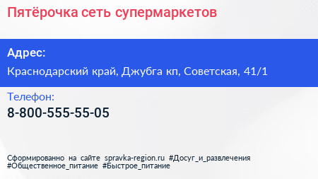 Пятёрочка, сеть супермаркетов по адресу Краснодарский край, Джубга кп, Советская, 41/1 в дальнейшем Организация, размещена в следующих категориях: