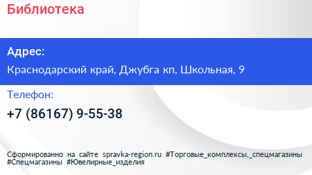 Библиотека по адресу Краснодарский край, Джубга кп, Школьная, 9 в дальнейшем Организация, размещена в следующих категориях: