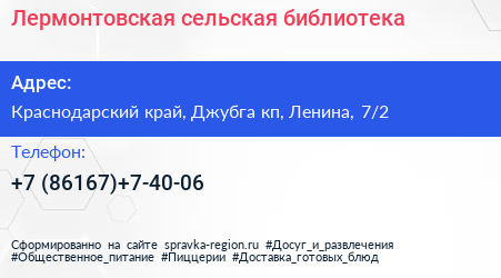 Лермонтовская сельская библиотека по адресу Краснодарский край, Джубга кп, Ленина, 7/2 в дальнейшем Организация, размещена в следующих категориях: