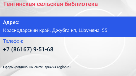 Тенгинская сельская библиотека по адресу Краснодарский край, Джубга кп, Шаумяна, 55 в дальнейшем Организация, размещена в следующих категориях: