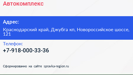 Автокомплекс по адресу Краснодарский край, Джубга кп, Новороссийское шоссе, 121 в дальнейшем Организация, размещена в следующих категориях: