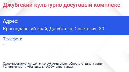 Джубгский культурно-досуговый комплекс по адресу Краснодарский край, Джубга кп, Советская, 33 в дальнейшем Организация, размещена в следующих категориях: