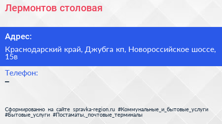 Лермонтов, столовая по адресу Краснодарский край, Джубга кп, Новороссийское шоссе, 15в в дальнейшем Организация, размещена в следующих категориях: