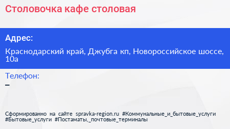 Столовочка, кафе-столовая по адресу Краснодарский край, Джубга кп, Новороссийское шоссе, 10а в дальнейшем Организация, размещена в следующих категориях: