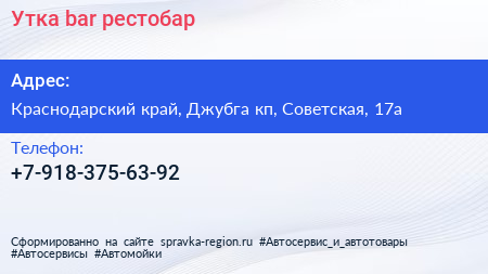 Утка bar, рестобар по адресу Краснодарский край, Джубга кп, Советская, 17а в дальнейшем Организация, размещена в следующих категориях: