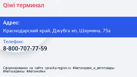 Qiwi, терминал по адресу Краснодарский край, Джубга кп, Шаумяна, 75а в дальнейшем Организация, размещена в следующих категориях: