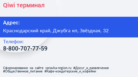 Qiwi, терминал по адресу Краснодарский край, Джубга кп, Звёздная, 32 в дальнейшем Организация, размещена в следующих категориях: