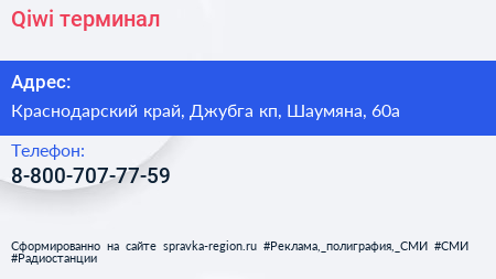 Qiwi, терминал по адресу Краснодарский край, Джубга кп, Шаумяна, 60а в дальнейшем Организация, размещена в следующих категориях: