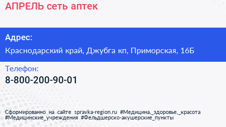АПРЕЛЬ, сеть аптек по адресу Краснодарский край, Джубга кп, Приморская, 16Б в дальнейшем Организация, размещена в следующих категориях: