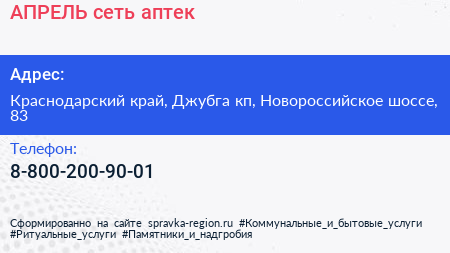 АПРЕЛЬ, сеть аптек по адресу Краснодарский край, Джубга кп, Новороссийское шоссе, 83 в дальнейшем Организация, размещена в следующих категориях:
