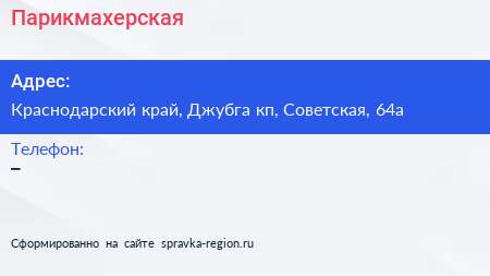 Парикмахерская по адресу Краснодарский край, Джубга кп, Советская, 64а в дальнейшем Организация, размещена в следующих категориях: