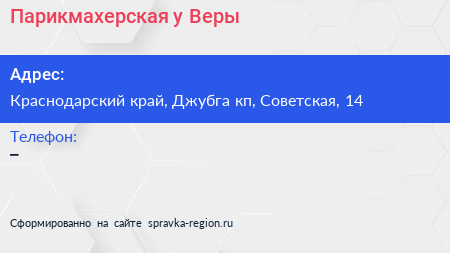 Парикмахерская у Веры по адресу Краснодарский край, Джубга кп, Советская, 14 в дальнейшем Организация, размещена в следующих категориях: