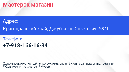 Мастерок, магазин по адресу Краснодарский край, Джубга кп, Советская, 58/1 в дальнейшем Организация, размещена в следующих категориях: