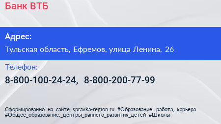 Банк ВТБ по адресу Тульская область, Ефремов, улица Ленина, 26 в дальнейшем Организация, размещена в следующих категориях: