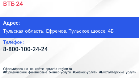 ВТБ 24 по адресу Тульская область, Ефремов, Тульское шоссе, 4Б в дальнейшем Организация, размещена в следующих категориях:
