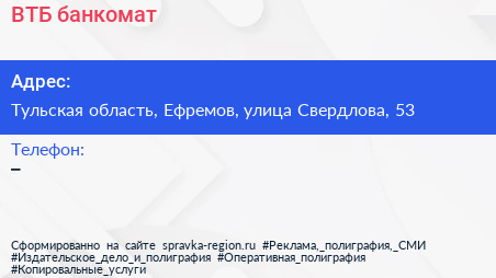 ВТБ, банкомат по адресу Тульская область, Ефремов, улица Свердлова, 53 в дальнейшем Организация, размещена в следующих категориях: