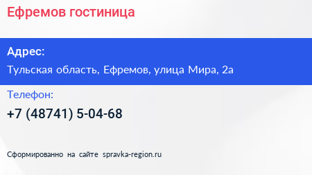 Ефремов, гостиница по адресу Тульская область, Ефремов, улица Мира, 2а в дальнейшем Организация, размещена в следующих категориях: