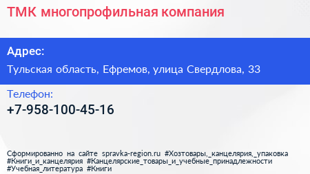 ТМК, многопрофильная компания по адресу Тульская область, Ефремов, улица Свердлова, 33 в дальнейшем Организация, размещена в следующих категориях: