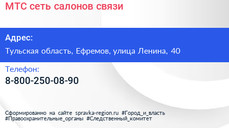 МТС, сеть салонов связи по адресу Тульская область, Ефремов, улица Ленина, 40 в дальнейшем Организация, размещена в следующих категориях: