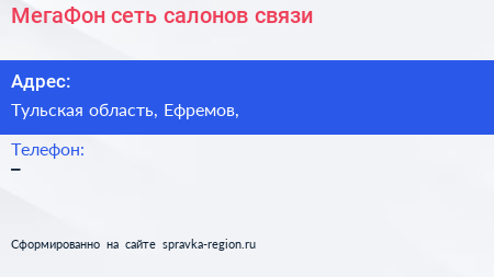 МегаФон, сеть салонов связи по адресу Тульская область, Ефремов, в дальнейшем Организация, размещена в следующих категориях: